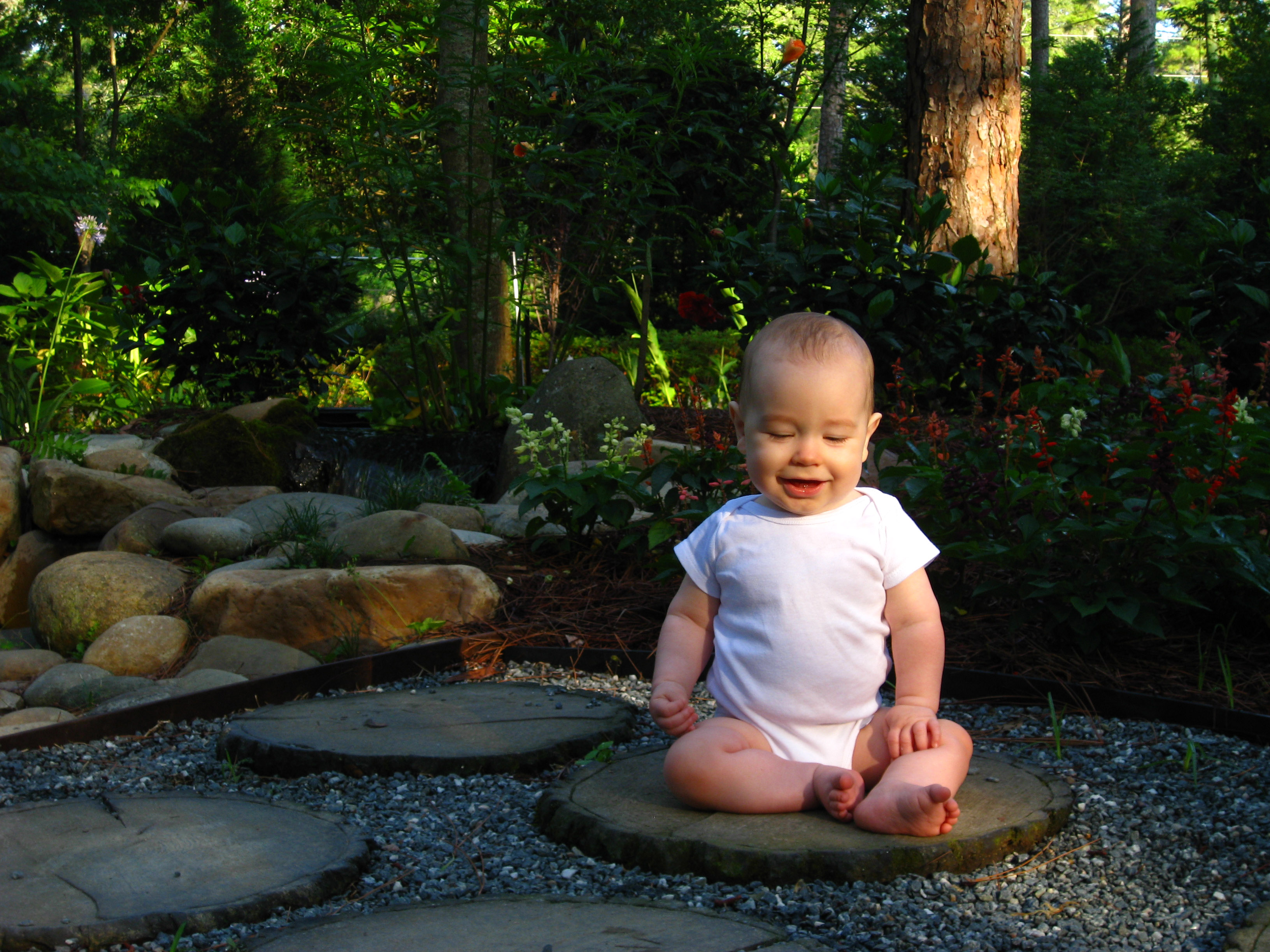 Here’s Elliot on a newer cedar swing just the same. They apparently added this whole area with water and flowers and this cute bridge.
