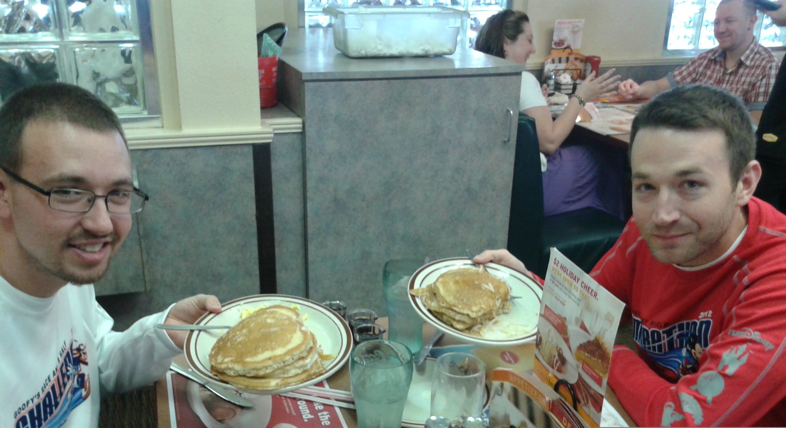 Hmm, I guess it was probably… the morning after the Disney half. The three of us went back to the hotel and changed and then went to Denny’s on International Drive. We all felt so glad to be done and to be eating a huge meal that we laughed a lot. It was a nice time. (neither of them would give me a real smile though)