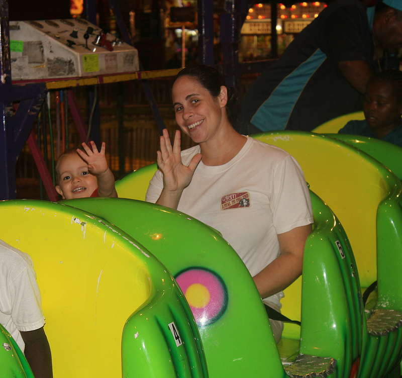We had an excellent time. Ell and Peyton had unlimited ride bracelets so they went at it. Isaac juuuust reached under the 36 inch minimum for most tides so he couldn’t go on a whole lot but he loved the bouncy house, which was seriously the best deal there: only 6 tickets and pretty much unlimited jump time. We ate corndogs (Courtney and Robert ate all kinds of junk: chili cheese fries, chicken on a stick…) and the kids rode themselves silly. Isaac could go on a few rides with an adult so I went with him on some.