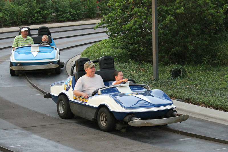 Though Thunder Mountain did not have a long wait, we decided not to go because a.) neither Isaac nor I could ride and b.) there were more kid things we needed to get to. So we hit up Pirates and after, in the gift shop, the boys both got Jack Sparrow swords. We then did the Aladdin magic carpets, which Isaac liked the best. Next, my mom and I got Dole Whips, which is a requisite item at Disney, in my opinion. Ash took the boys up in the Swiss Family Robinson treehouse then too. I wanted to do the Jungle Cruise but 45 minutes is way too long for fake animals. We then crossed back over to Main Street in search of food. We ended up in TomorrowLand at Cosmic Ray’s, because Elliot cried for a hamburger. After eating, the menfolk went on the Speedway while my mom and I took a brief rest.