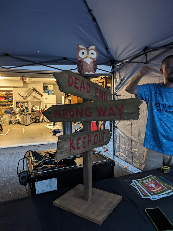 - OK, the last entry is dedicated to the photos I said I’d post. The one is my painted owl and then what we did with him. The signs are technically the names of our beers for this event and obviously, it goes along with the spooky theme.