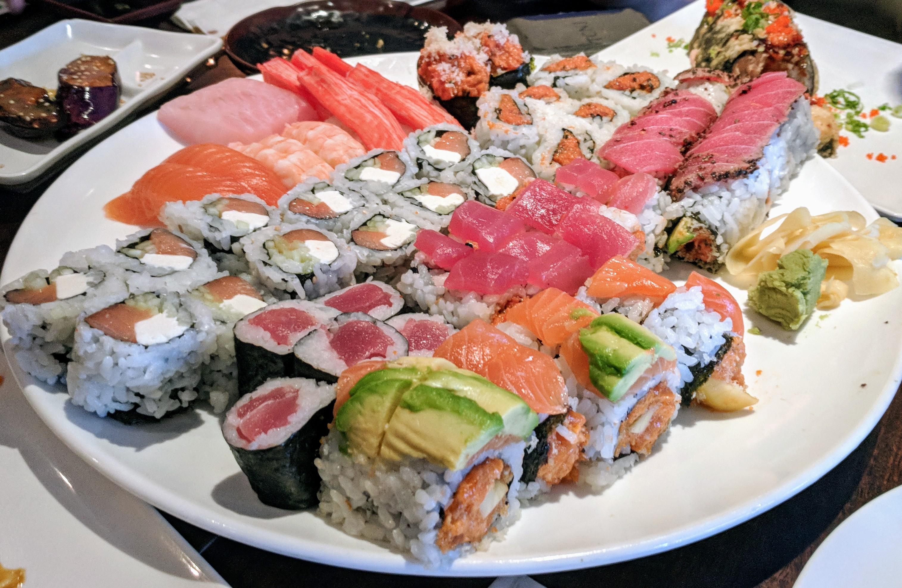 And even though I do love food, I don’t know if there’s any one food I’d gorge on. Though now that you mention it, I was thinking about sushi this morning. My son and I might go out for it later next week and I was planning what I want. At this one place we go, if you order the big roll, e.g, a Dragon Roll or some such, you get a basic one for free. This isn’t the best pic but if you look in the foreground, that’s a big roll and the free one.