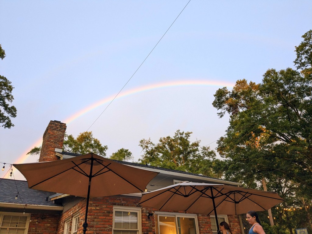 Our neighbors were going to come to the beach too but by the time they got out there the weather was already bad so they actually turned around and never ended up meeting us. So later at dinner, they texted to ask if we still wanted to hang. Around 5/5:30 they came over and their daughter and Koda swam and we drank. It was nice, actually. Sat outside with our feet on the pool and at one point, we finally got a little sun and a great rainbow! I like our neighbors and I’m glad we know more people who live around us.