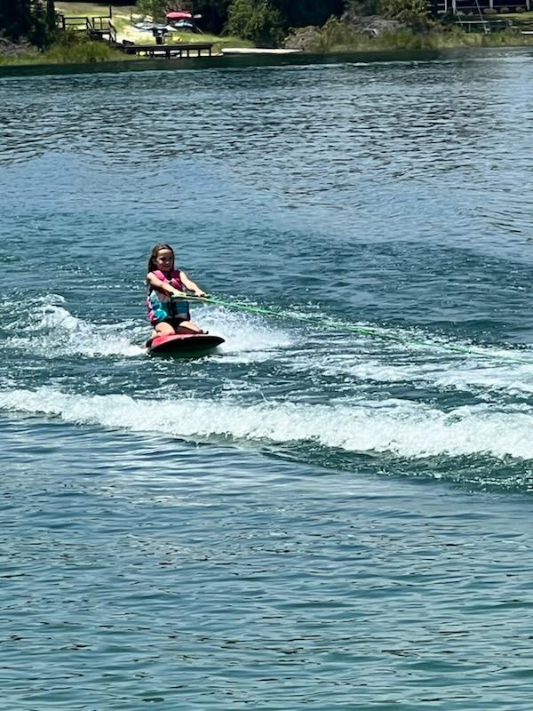 This week is going to be crazy busy! Movie tonight, then tomorrow, Isaac starts soccer so, evening practice. Ash has a fantasy draft so we’ll be headed to a pizza place around 7:30 for that. Wednesday we have the work league draft at Amicus at 4. Thursday Isaac has practice and we have brew club EC meeting. It’s a lot every night! Thankfully, we don’t have anything Friday and Saturday. Sunday, we’re finally having Dakota’s actual birthday party. Here’s a pic of my daughter kneeboarding and that about does it!