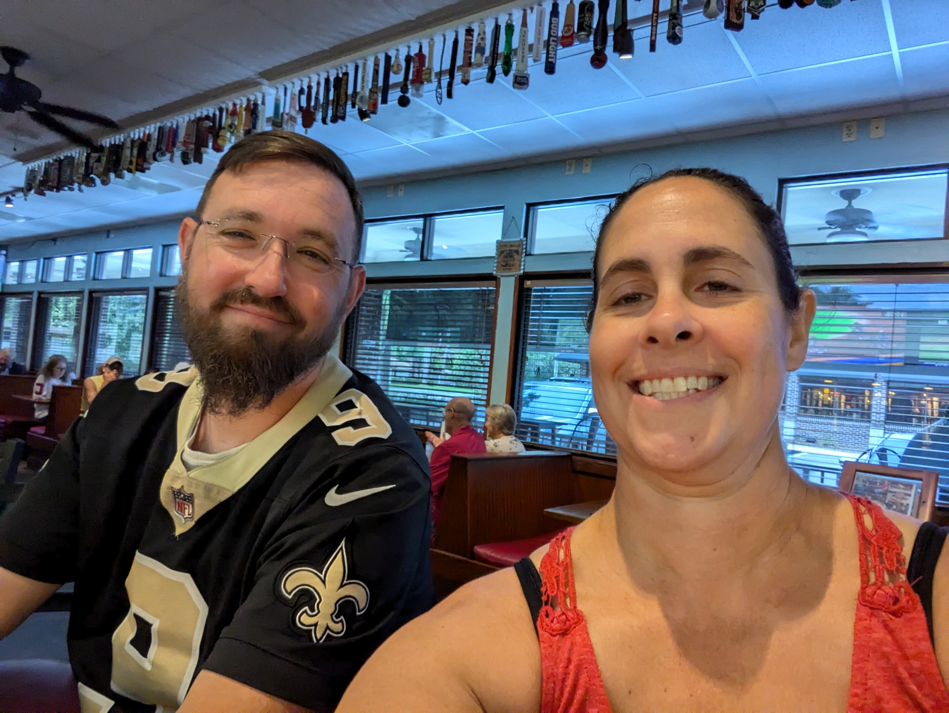 Sunday we had to get stuff done early because we were headed to Gainesville. Elliot got right up and mowed since he had to work at 9, then Isaac followed and got his yard done. We left town by 10 so we could drive the two hours to the swamp. (I kid; I know UF people hate Tally the way we think of Gainesville as a swamp.) Ash and I ate beforehand at Crafty Bastard, since we’d been before. They have a solid burger and a good beer selection. My neck looks bad in this photo but everyone shares so many pics, I feel like I should.