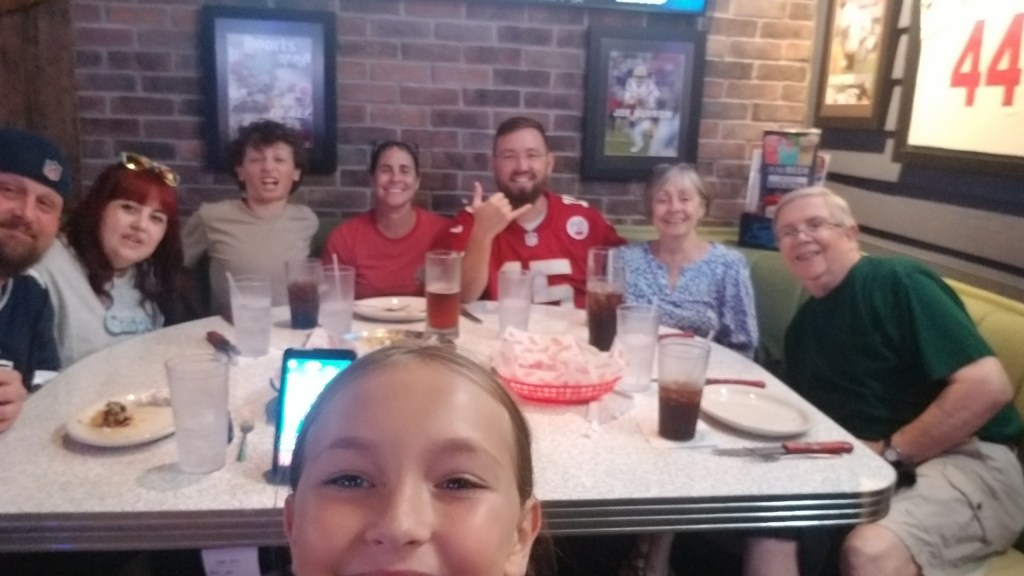Anyway, Dakota and I drove together and were about 45 minutes behind Ash and Isaac. They went to my parent’s house first but we went straight to Bubba’s 33, which had sort of a sports bar/Chili’s vibe. We met them and then my sister and her boyfriend came so that was nice. My dad likes to take us all out, since they got this extra money from my grandfather’s estate. It’s not like they got a ton but it makes him feel good to be able to treat us. And he did – he ordered three appetizers! We never do things like that. Needless to say (which is a phrase I hate, btw) I ate way too much. But we had a nice time with family and while watching football. Here’s a really awful photo because it focused on my daughter’s face instead of us. Also, my middle child always make an awful face in pics.