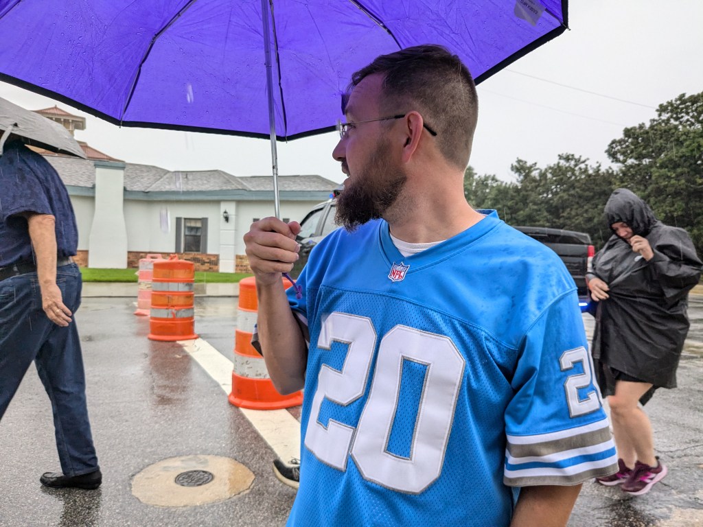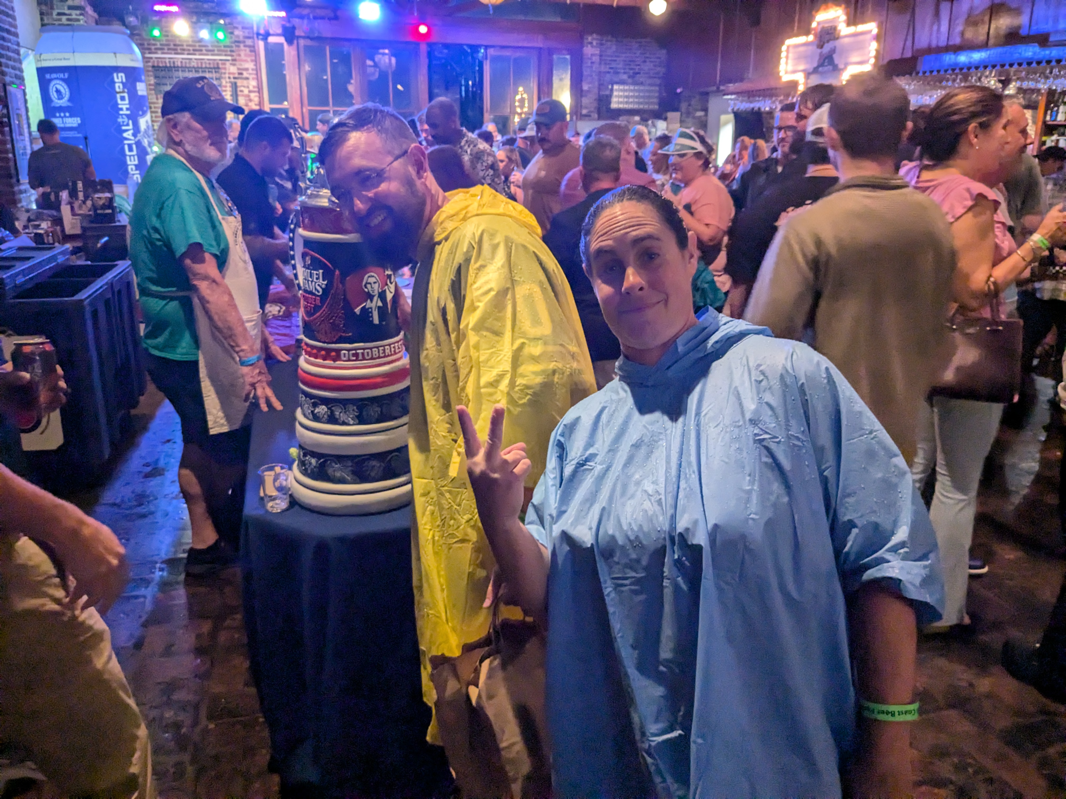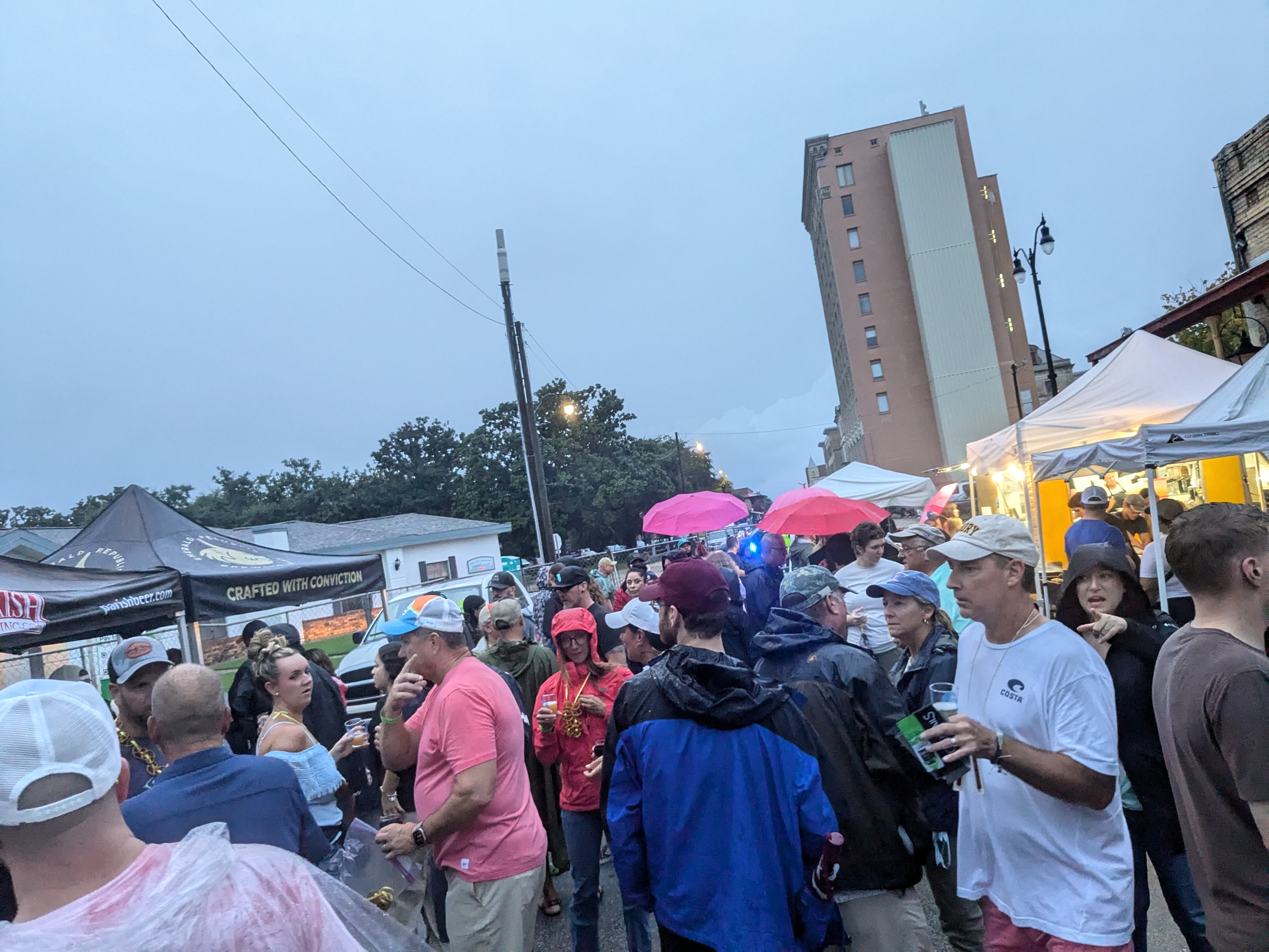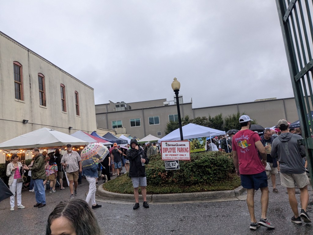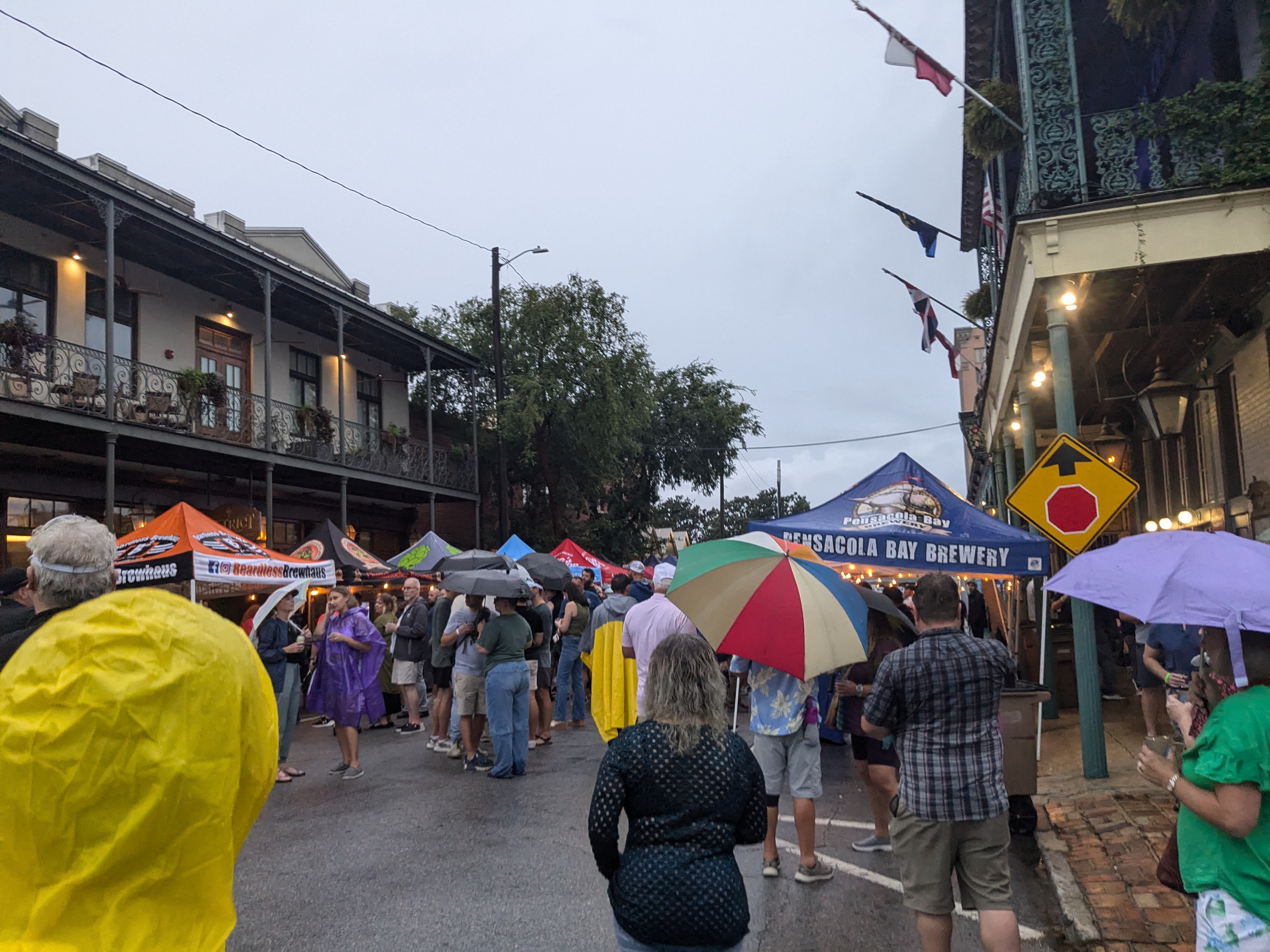 Anyway, we had fun at the mall, mostly because Pensacola’s is rather thriving, in an age where most are dying out. We smelled a variety of fragrances at my sister’s store, got some fun socks, and attempted to have ice cream but the Chik-fil-a machine was broken. What is this, McDonalds?? We went home and rested for a bit before it was time for the Emerald Coast beer fest. Ash and I grabbed our umbrellas and my dad dropped us off. We were early so we went to a place called the 5 Barrel, which we’d been to before and liked, though they seem to have a lot less of their own beer on tap now. We each just had one then got in line. We had friends going and with the rain and all, it wasn’t hard to find them right away due to lower numbers.