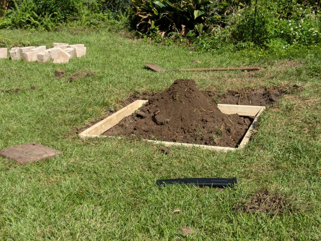 Anyway, I had a bunch of work work to do Friday and I did them pretty early, which is good because by 9, Ash had us back on the fire pit project. We went to Lowe’s, built the wooden frame, then dug out the space a bit more before staking it in and making sure it was level. All that took roughly 3 hours, if you include showering.