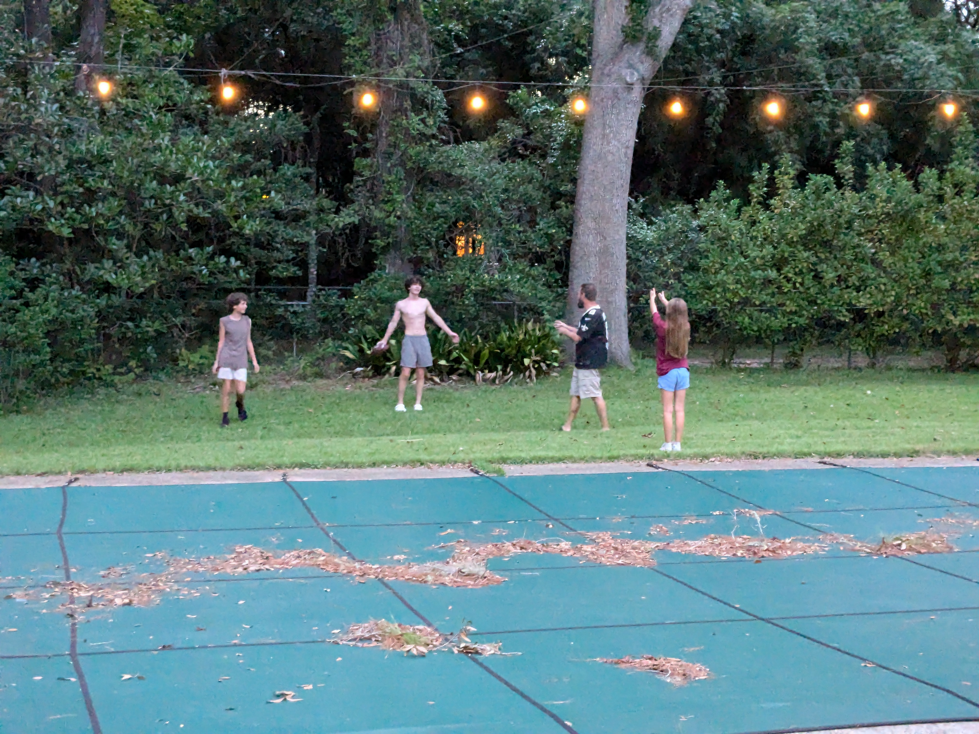 Three, my parents came through town last night on their way home and took us out to dinner. Even my oldest was home so he got to go – he’s normally working. After dinner (of which I took zero photos) the kids asked my husband to throw them the ball – a family pastime that always ends in tears. But for a moment, they all got along.