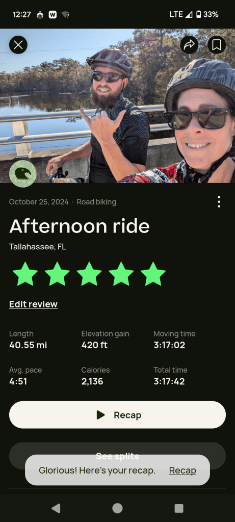Happy Monday, everyone. It was quite the weekend, let me tell you! I mentioned in my Friday 5 that we went to Trivia on Thursday so that was a nice way to start things off. Friday, we planned to leave kind of early to get a ride in, knowing the weekend would be too busy. So Ash and I went to St. Marks to do 40 miles, flat.
