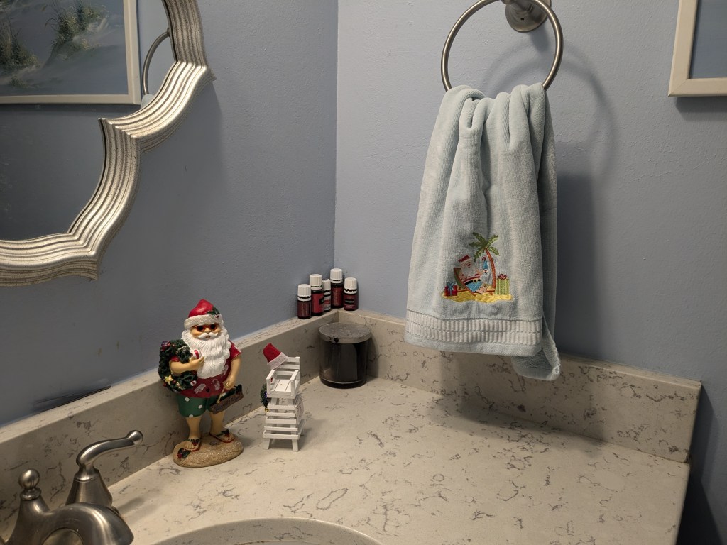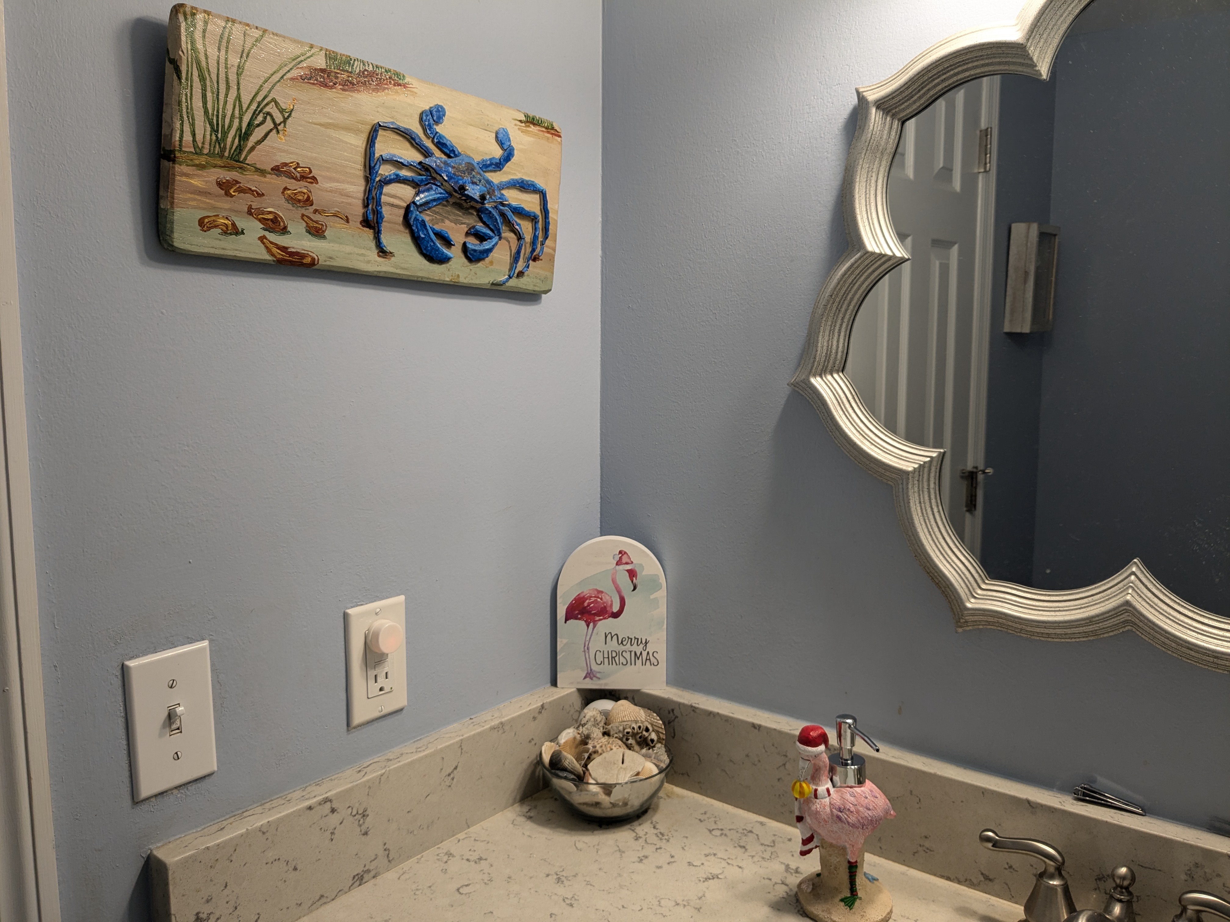 I made burgers on Sunday and we watched football. The temps have been consistently low 30s/mid 60s, which means I just don’t feel like doing anything! Fair to say, I did many little things I meant to do: go to the outdoor store we have that does Christmas up big and get a new pickle for the tree (ours broke last year), and also, to Beall’s for a new Xmas soap dispenser. I took photos in my coastal bathroom for a Facebook group I joined.