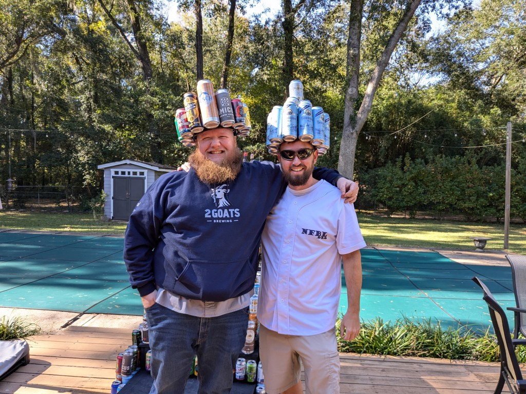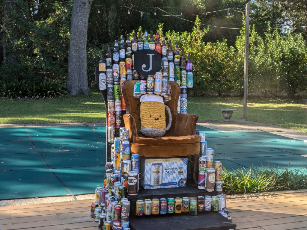 Both Ash and Joyner attempted beer crowns and then our other friends made the throne The bigger guy there, Mike, was the person who brought the most homebrew last year so it is actually “his”, though each year a new person will get to achieve this goal, should they so choose. His wife made the crocheted beer glass – “Steiny” as they dubbed him. All in all, a good time. I think the last person, our VP, left around 7 and after putting some leftovers away, I sat down to relax!