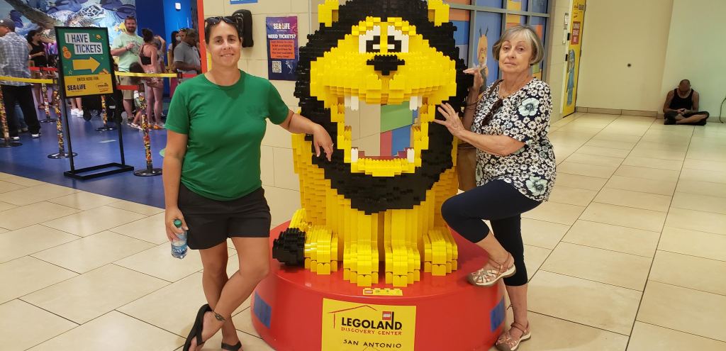 My mom and I tend to immediately distrust something or someone; it’s not a good trait to share with her! But we also do like to talk to people, especially each other, and we both like cooking. Here we are in a San Antonio mall with a Lego lion.