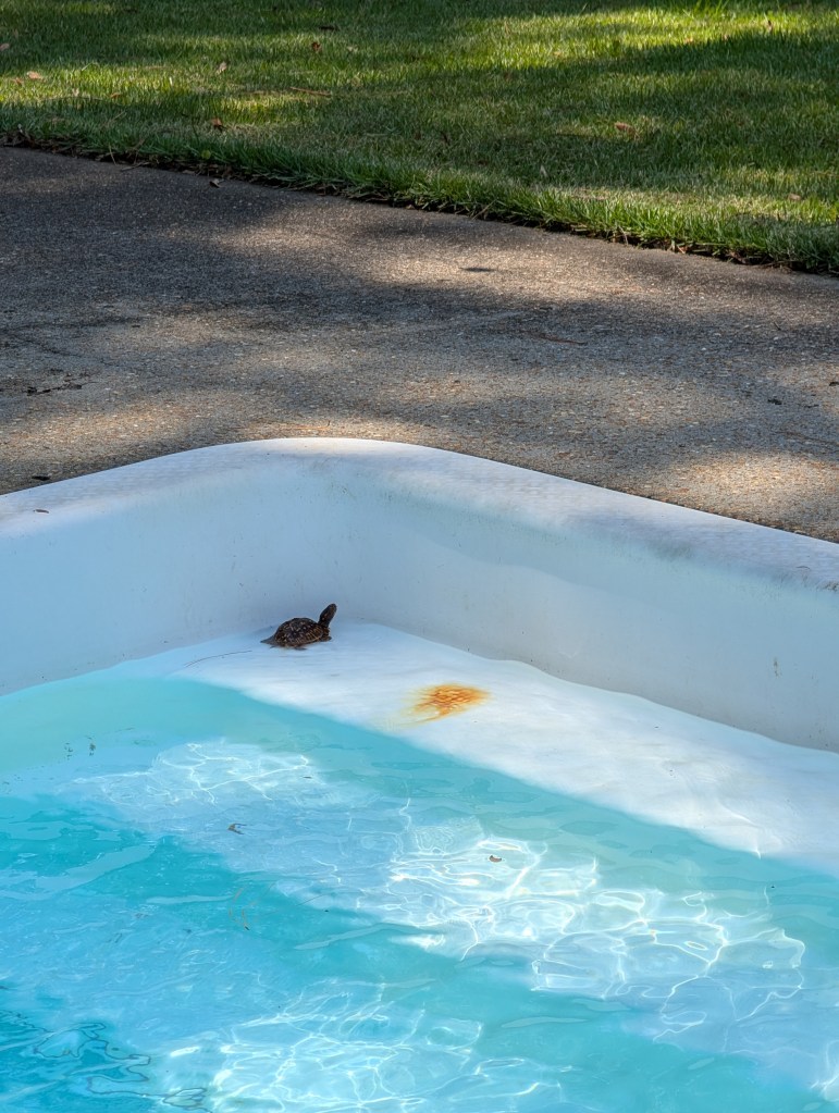 - My yard is nature central these days. So, every summer for the past 3 years, we’ve seen a box turtle around. They only live in a two mile radius, after all. A couple months ago I saw him by the deck and assumed he lived under it and I was worried he’d end up in the pool, though never had before. Well yesterday he did! I was washing dishes and looked out the window to see him swimming around in there. I went out and skimmed him up, then deposited him back towards the deck, under which he scurried. About an hour later, I see him on the first step, clearly enjoying himself. Bro! So I rescued him once more and took him back to the deck. I got to thinking he wanted water so I put some in a bucket and created a little ramp out of a pool noodle and kick board. I haven’t seen him use that but maybe today. Picture below for reference as well.