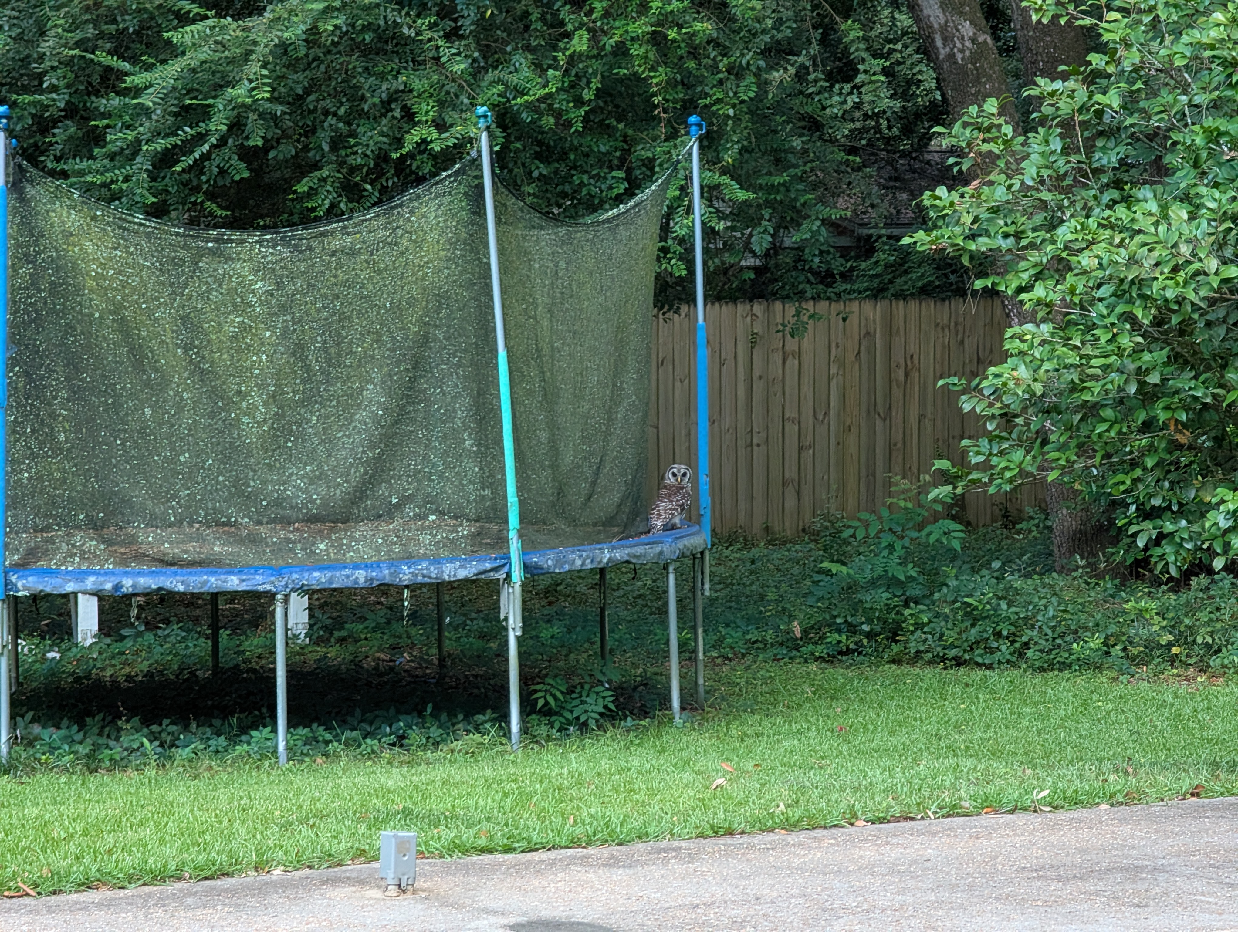 - I woke up and had to go check my pool, even though I logically knew it would be clear and blue – and it was. Funny thing is, as I was looking at it, I noticed something weird sitting on the edge of the trampoline. At first I thought it was a log of some sort that fell. Upon closer inspection, it was our friendly neighborhood barred owl. I got closer and noticed he was all puffed up and not looking at me despite my approach; he was asleep! I grabbed my phone and went back for a photo but of course, then he looked at me. I shall post photos below because…
