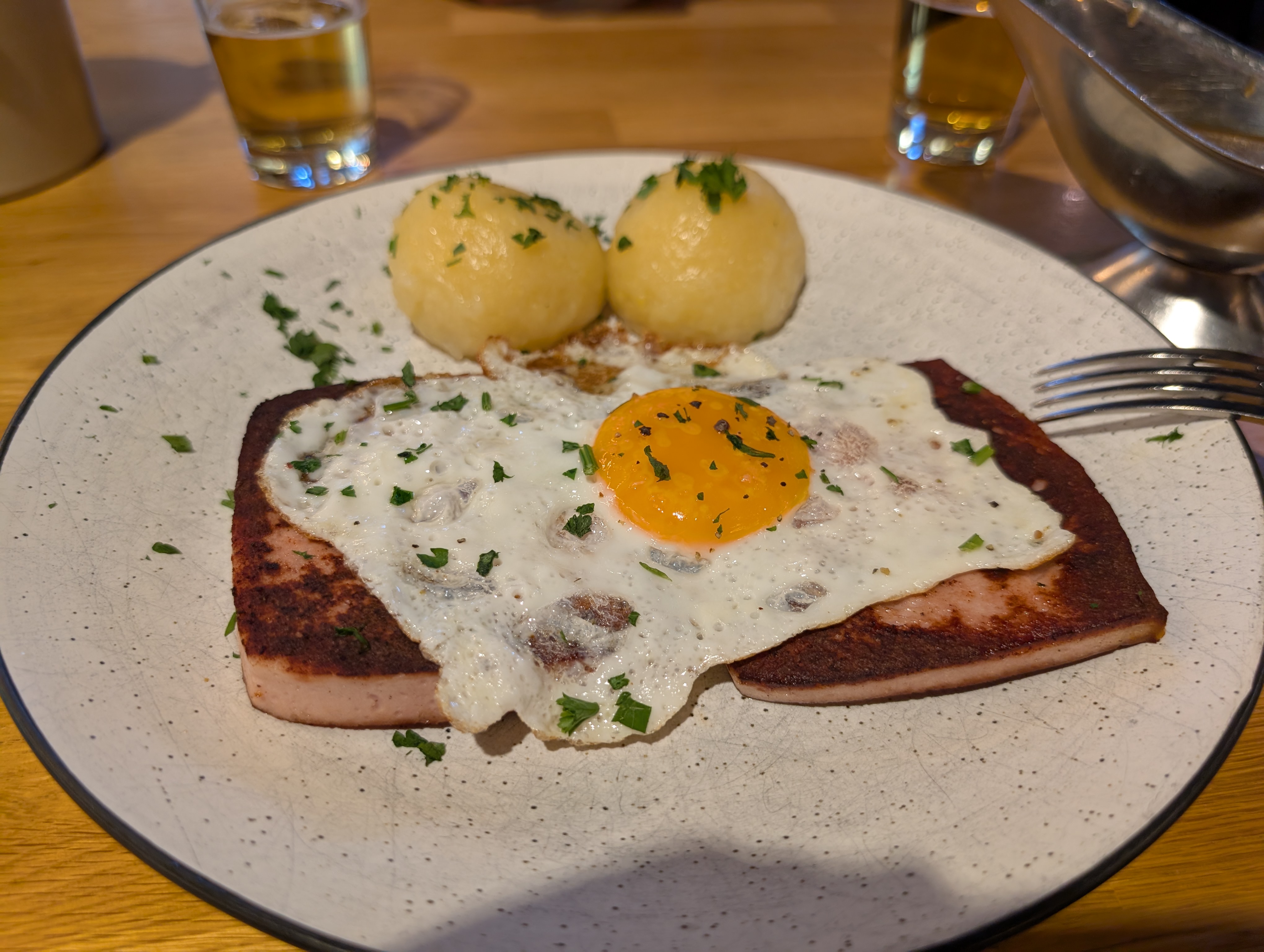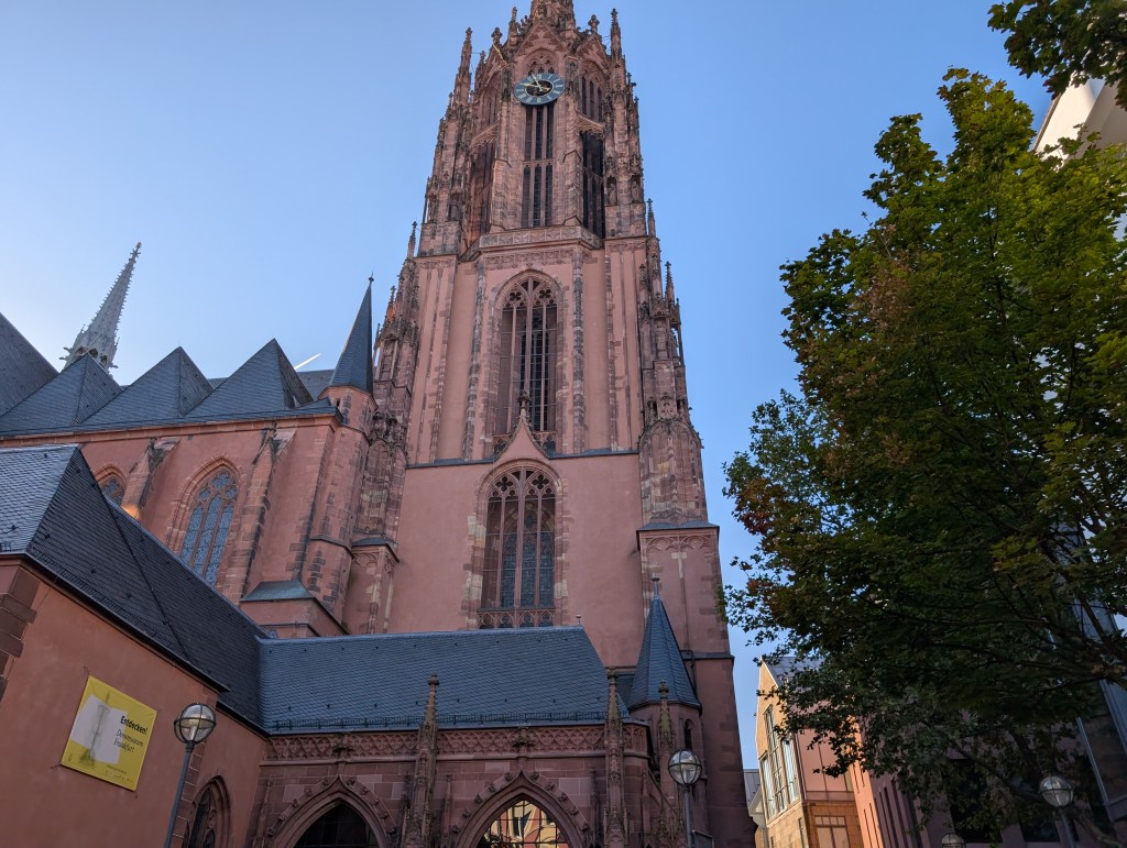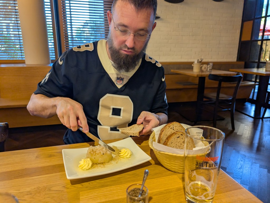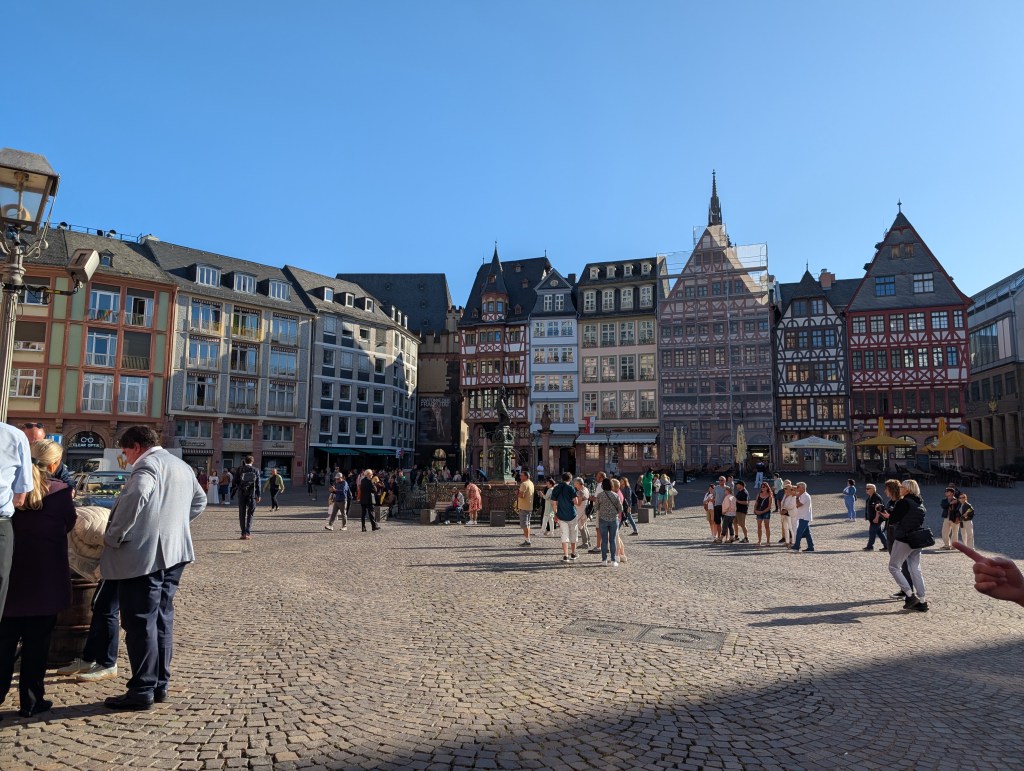 Day two had us seeking the church there, which is near a rebuilt area made to look old. We checked out the church and the surrounding areas, just walking and looking at things. We wanted some German food, though quickly found out the stuff we were looking for was mainly only found in the Bavaria region. We did find a place doing Oktoberfest specials. Our waiter was a younger guy who has family in New York so he was really chatty and nice. I got the leberkase, which is kind of like a Spam patty and they pair it with eggs and these rather tasteless potato balls. Our waiter convinced us to try a Frankfurt original, which consists of a very hard stinky cheese slathered in onions and onion infused oil. I eat a lot of foods but even I hated it. Ash of course did but that goes without saying. At least the waiter was nice and have us some insight; people apparently really dislike the Germans from Munich. They think they are too proud. Interesting! It’s kind of like how a lot of people from the South look at Yankees, I guess.