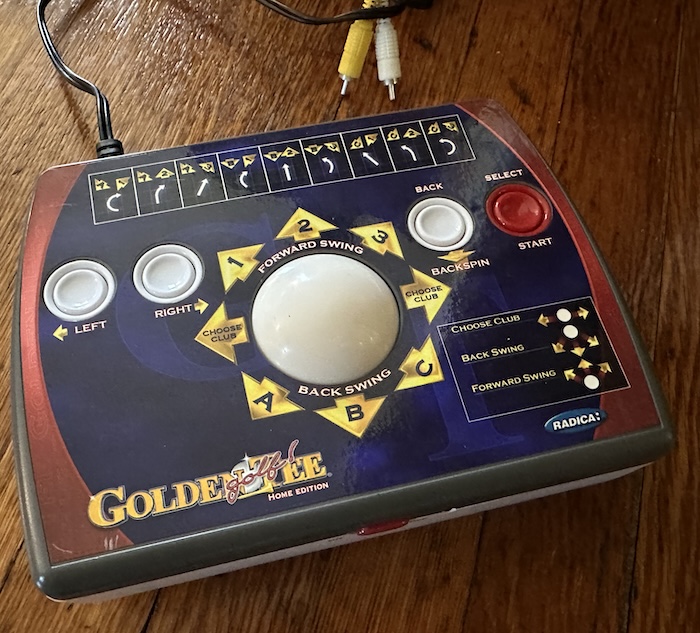 I am sure this doesn’t mean much to many of you but the first thing that came to mind is Golden Tee. We don’t actually PLAY that golf game but we use the control panel to play Silver Strike bowling. But it’s something Ash and I love playing together while we listen to music. I am putting a picture below because it kind of looks like that, though ours is wider, like a regular console. We have it on top of a cabinet we got at Goodwill and then the screen is just a TV in the living room. (second photo is the best I had)