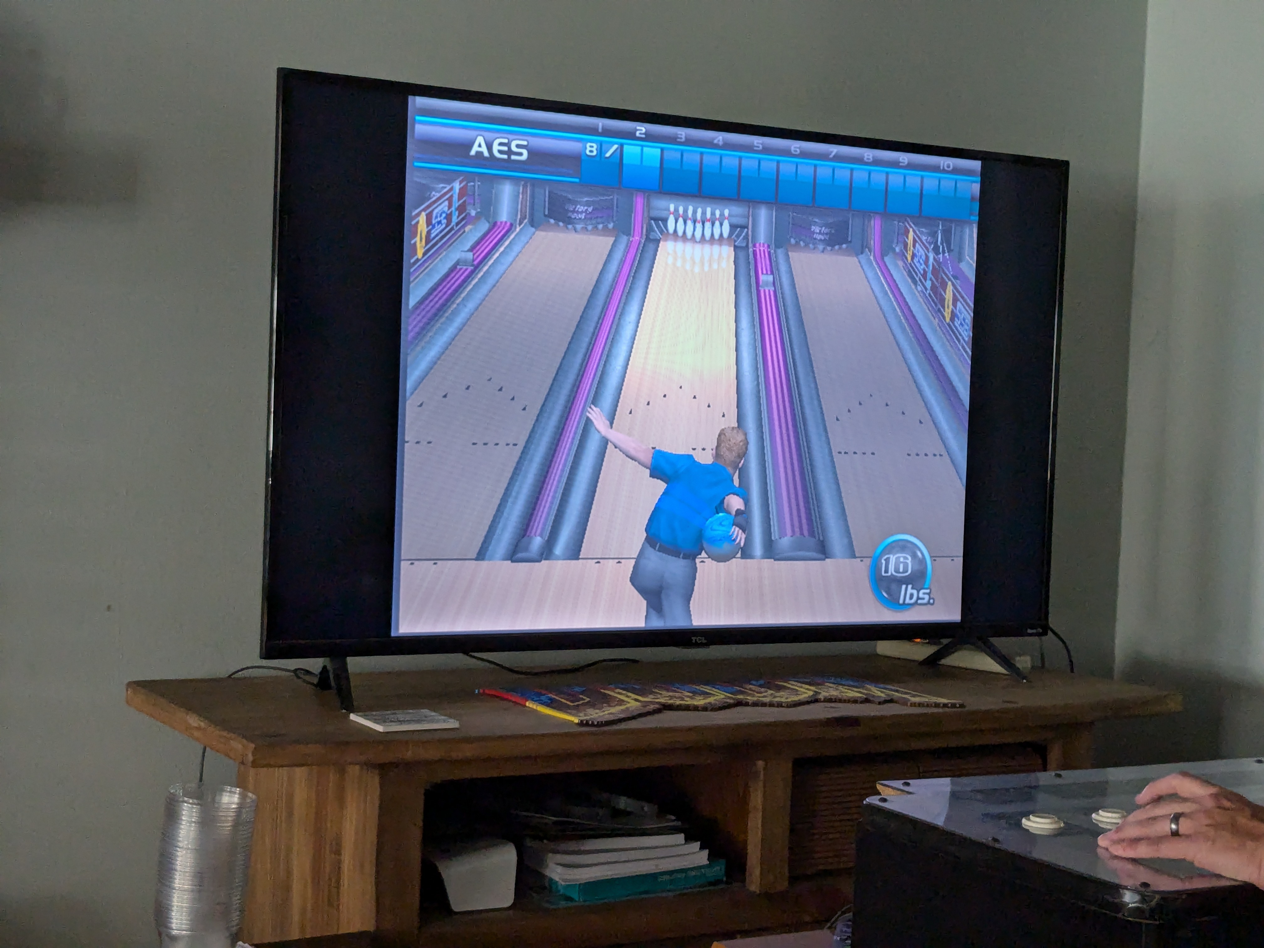 I am sure this doesn’t mean much to many of you but the first thing that came to mind is Golden Tee. We don’t actually PLAY that golf game but we use the control panel to play Silver Strike bowling. But it’s something Ash and I love playing together while we listen to music. I am putting a picture below because it kind of looks like that, though ours is wider, like a regular console. We have it on top of a cabinet we got at Goodwill and then the screen is just a TV in the living room. (second photo is the best I had)