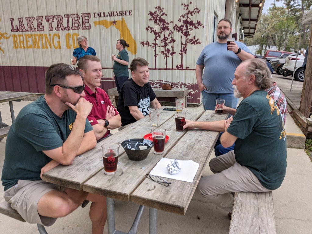 When it was finished, they threw it on tap and made a sign to indicate that we had collaborated. Here’s a pic of a group after brewing then, a few weeks later trying the product. It turned out, I daresay, better than most of their typical beer. Which is saying something!